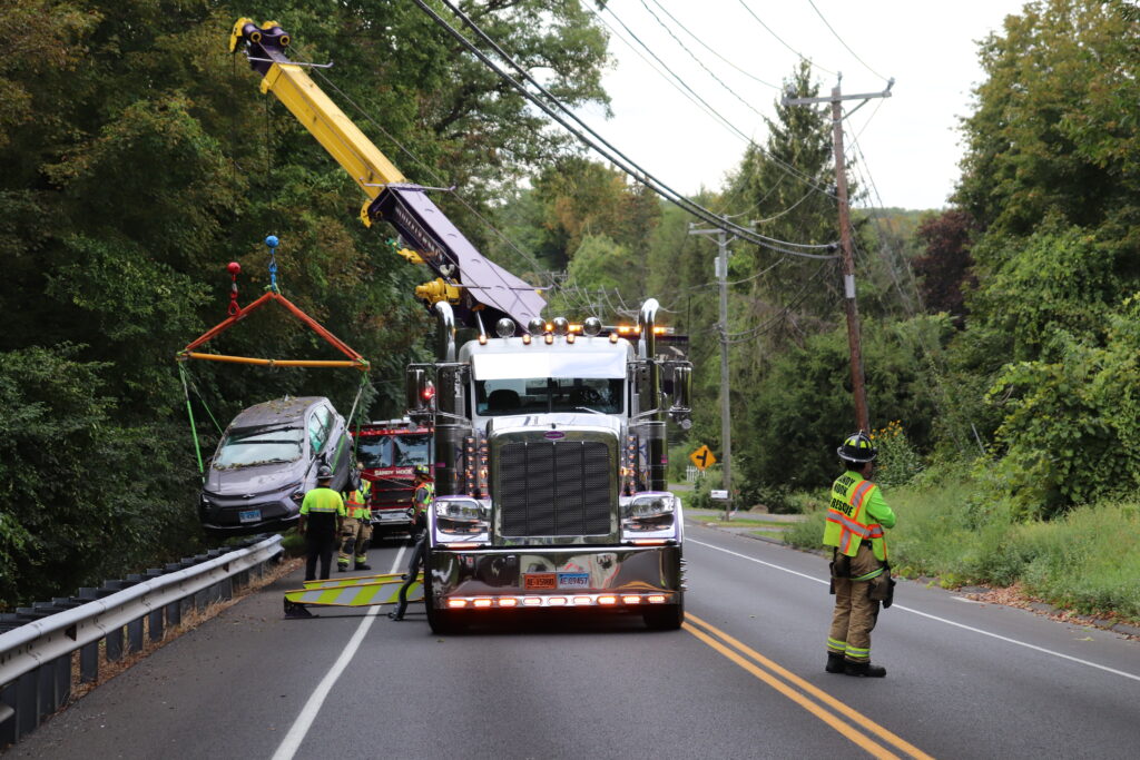 Upon arrival, Lieutenant Archie Paloian confirmed a 2023 Chevrolet Bolt that had been traveling east on the state road had gone over a steel guardrail and then down a steep embankment.