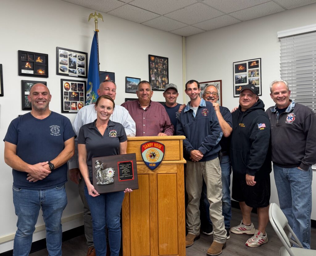 Karin Halstead is joined by SHVFR Chief Anthony Halstead (left) and fellow officers and members of Sandy Hook Volunteer Fire & Rescue Company shortly after she was named Fairfield County Fire Chiefs 2025 Bill Halstead Firefighter of the Year.