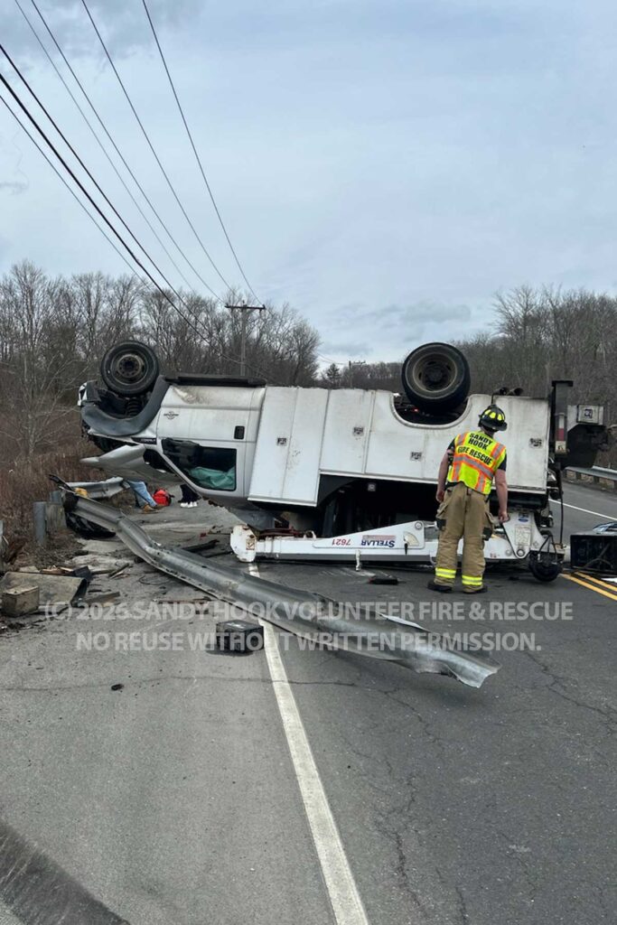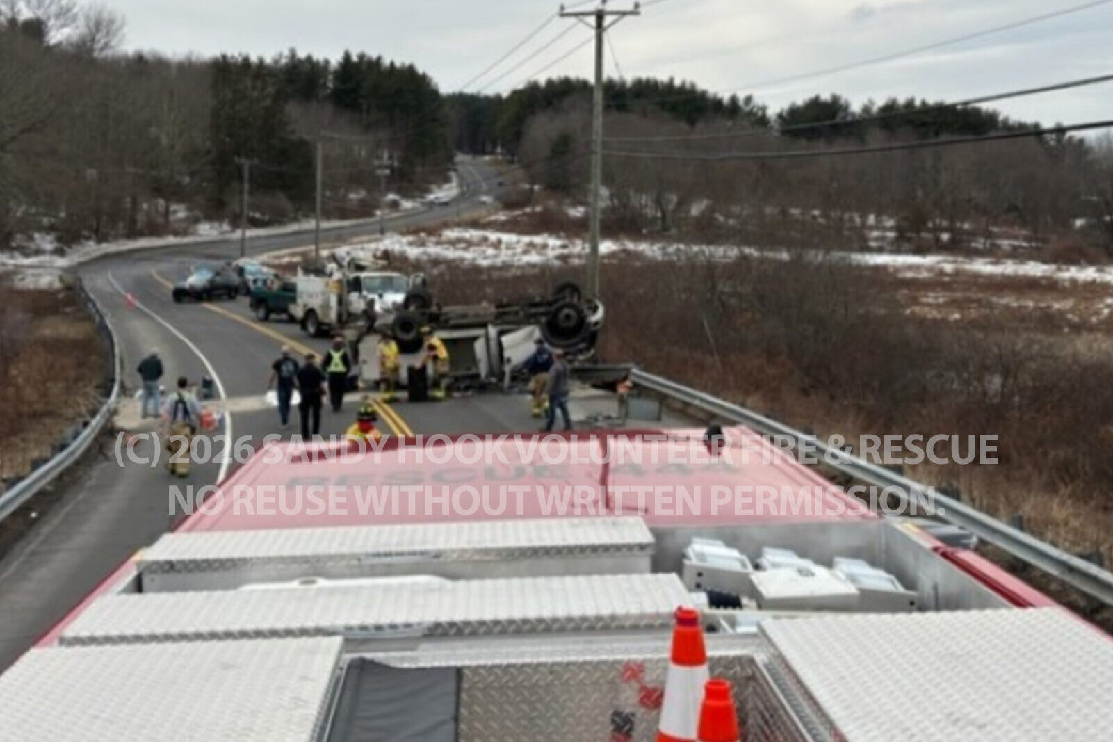 Sandy Hook VFR, Newtown Volunteer Ambulance Corps and a paramedic were dispatched at 13:42 to Wasserman Way at Nunnawauk Road after SHVFR Deputy Chief Ryan Clark and Second Engineer Bruce Clark pulled up to a rollover with possible injuries.