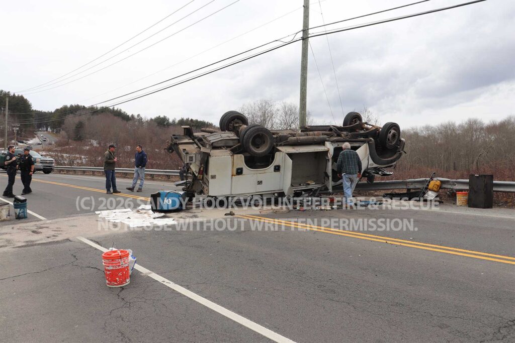 DC Clark reported a utility truck had rolled over and was actively leaking fluids into nearby waterways which included the Pootatuck Aquifer. DC Clark estimated 20 gallons had already leaked from the truck, which was still leaking. The truck clipped a utility pole and damaged approximately 60 feet of guardrail.